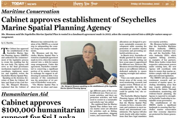 The Cabinet has approved the establishment of the Seychelles Marine Spatial Planning Agency (SMSPA) and authorised the commencement of the legislative process to create the enabling law for the new body. The Agency will serve as the final governance mechanism required to oversee, coordinate, implement, monitor, and regularly review the Seychelles Marine Spatial Plan.